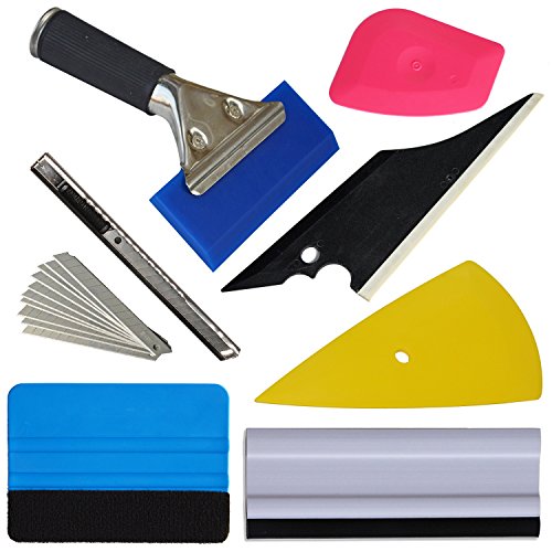 - This kit set has: Rubber Jelly Squeegee, 4" Felt Squeegee, Pink Scraper, Contour Squeegee, Conqueror Squeegee, 6" Block Squeegee, Film cutter with 10 blades